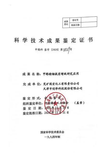 2020年底,中國煤炭工業協會組織有關專家,對國宏公司及創舉科技共同申報的“甲醇精餾提質增效研究應用”技術進行科學技術成果鑒定。經專家鑒定,該項技術成果達到“